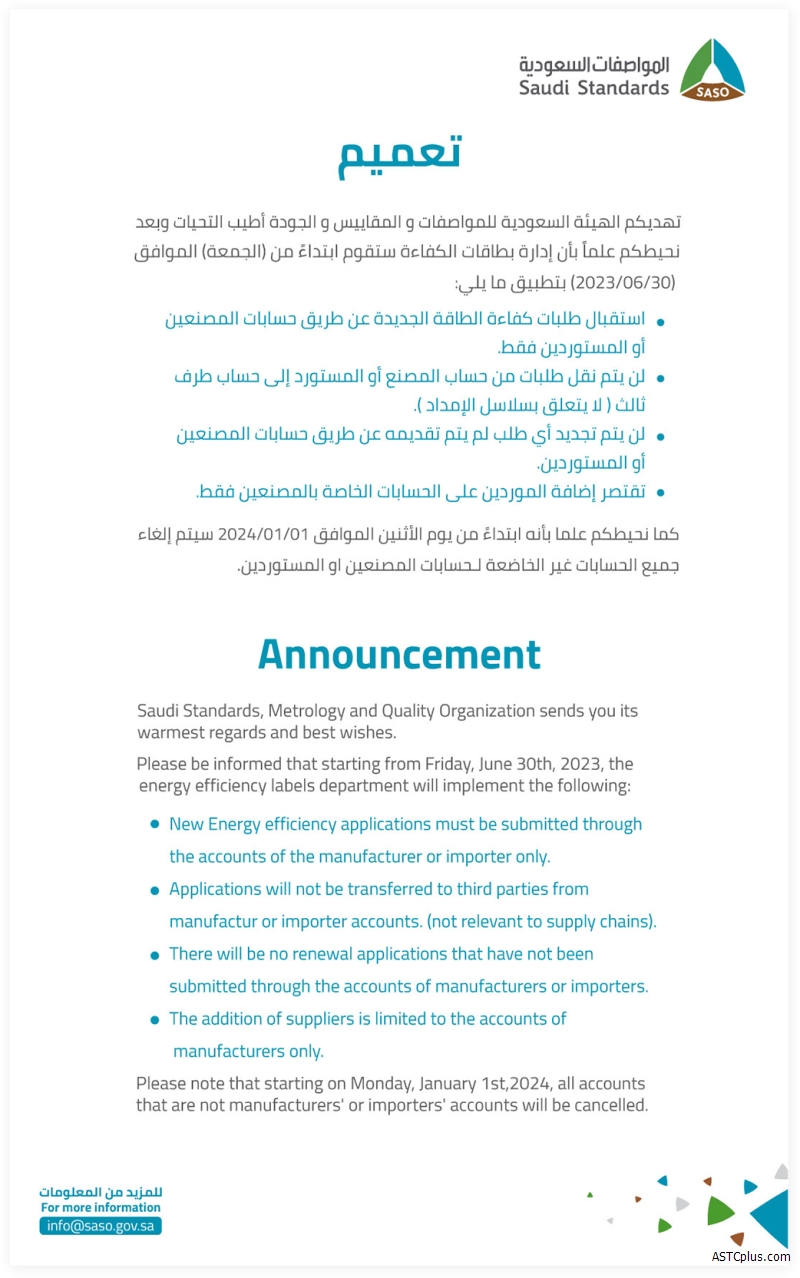 Please be informed that starting from Fridav, June 30th, 2023, the energy efficiency labels department will implement the following