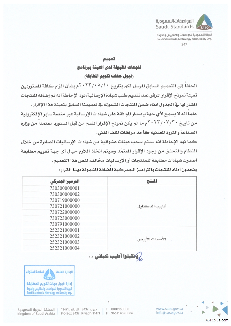 According to the SASO notification, starting from July 30, 2023, for products corresponding to the customs codes listed in the table below, applicants must provide a declaration from the Ministry of Industry and Mining and obtain their approval when applying for a product certificate through the SABER system.