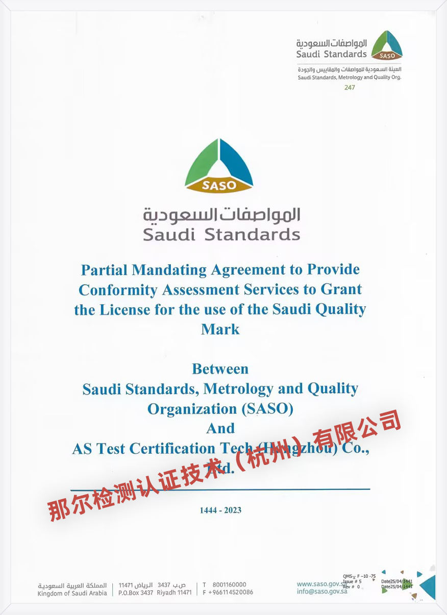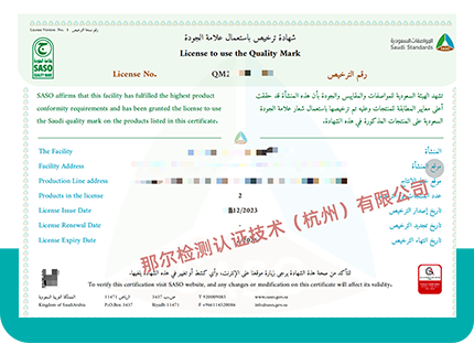 ——The SASO Quality Mark certificate, also known as SASO Q Mark, actually both refers to Saudi Quality Mark which is a product qualification mark issued by Saudi Standards, Metrology and Quality Organization(SASO). it can be used to prove products comply with SASO standards and are produced by factories with effective management systems. This certification adopts the ISO/IEC 17067 Category 5 conformity assessment plan and is applicable to products manufactured locally in Saudi Arabia or exported to Saudi Arabia.